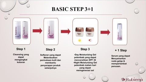 Cara pemakaian Rubiena Brightening Series disebut sebagai Step 3+1, yaitu: