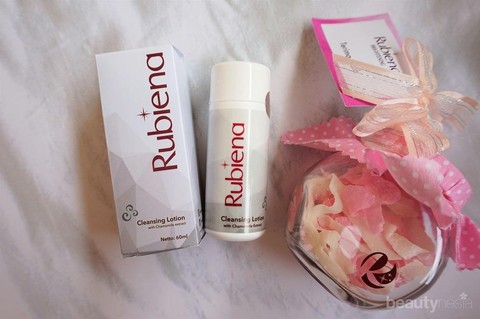 - Cleansing Lotion, yaitu pembersih dengan tekstur lotion berwarna putih yang bermanfaat untuk mengangkat sisa makeup dan kotoran lebih maksimal agar pori-pori tidak tersumbat. Kemasan dari cleansing lotion ini packaging-nya berupa botol dengan tutup ulir. Ketika diaplikasikan juga cepat diserap kulit. Cleansing Lotion ini satu-satunya produk Rubiena yang mengandung alkohol. Harganya sekitar Rp65.000 untuk kemasan 60 ml.