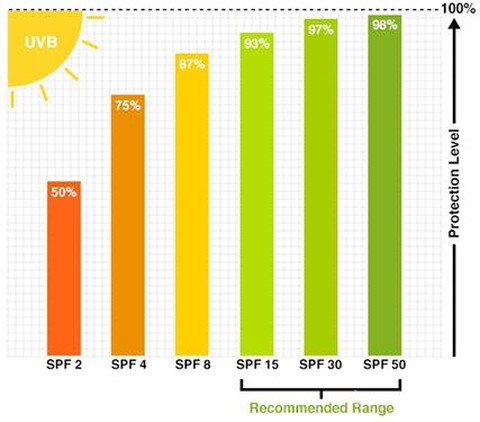 Tak ada UV filter yang dapat 100% memantulkan radiasi sinar matahari. Perlindungan sunscreen akan mentok setelah mencapai titik optimum. Misalnya, SPF15 melindungi dari 93% radiasi sinar matahari, SPF30 melindungi dari 97% radiasi sinar matahari, sementara SPF50 melindungi dari 98% radiasi sinar matahari. Lihat bagaimana selisih perlindungan yang paling besar ada diantara SPF15 dan SPF30?