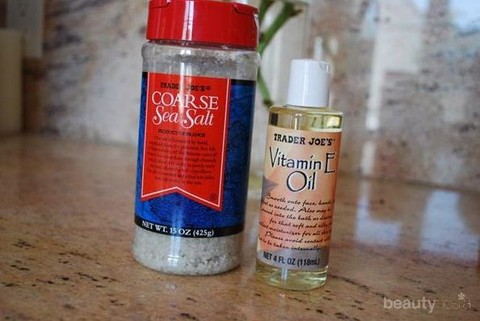 Campuran antara garam laut dan vitamin E akan menjadi eksfoliator yang baik bagi kulit berminyak. Jangan takut dengan vitamin E yang berminyak karena garam laut, selain ampuh mengangkat sel kulit mati, akan menyerap minyak berlebih. Lagipula, vitamin E dapat menciptakan kulit yang sehat dan glowy. Yang perlu kita lakukan adalah mencampurkan lebih banyak garam laut bersama minyak vitamin E ke dalam wadah lalu diamkan sementara agar tekstur garam laut dapat melembut.