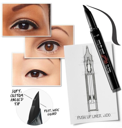 Benefit designed the pen to fit perfectly in your hand. The tapered body makes it easy for you to apply the liner in any position. The patented AccuFlexTM tip is the biggest point of difference from all other liners. They're Real! Push-Up Liner is the only liner that has a tip that is wide, angled, and flat. The AccuFlex tip draws an easy line along the curved surface of your eye and a flat, wide guard pushes your lashes aside so you can get closer to the lash line.https://theglossy.sephora.com/articles/932/zoom-in-benefit-they-re-real-push-up-liner |