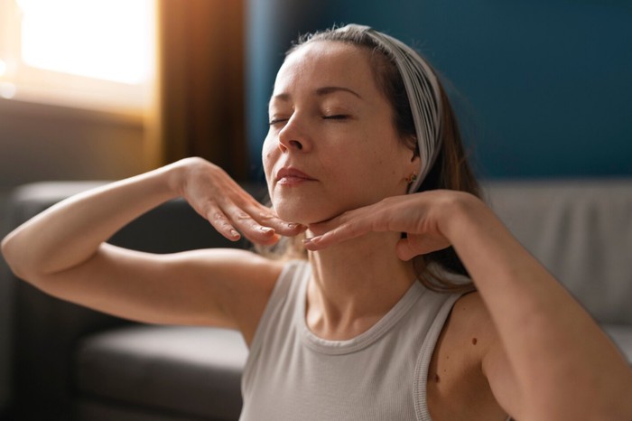Senam wajah atau facial exercises dipercaya mampu membantu mengencangkan otot dagu, leher, dan rahang. Gerakan sederhana seperti menengadahkan kepala sambil menekan lidah ke langit-langit mulut, atau menggerakkan rahang ke depan, bisa melatih otot area bawah wajah. Menurut Harvard Health, walaupun bukti klinisnya masih terbatas, latihan wajah aman dilakukan dan bisa memberikan sedikit perbaikan kontur wajah bagi sebagian orang.
