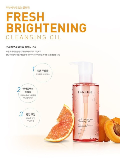 Satu lagi produk skincare dari Korea yaitu Laneige Fresh Brightening Cleansing Oil. Pembersih berbahan minyak aprikot, minyak grapefruit, vitamin C, Salicylic Acid dan Gypsophila Paniculata Root extract yang merupakan pembersih alami, menyegarkan, mengangkat sel-sel kulit mati dan mencerahkan kulit. Cleansing oil ini bisa kamu dapatkan di list.qoo10.co.id dengan harga Rp139.000.