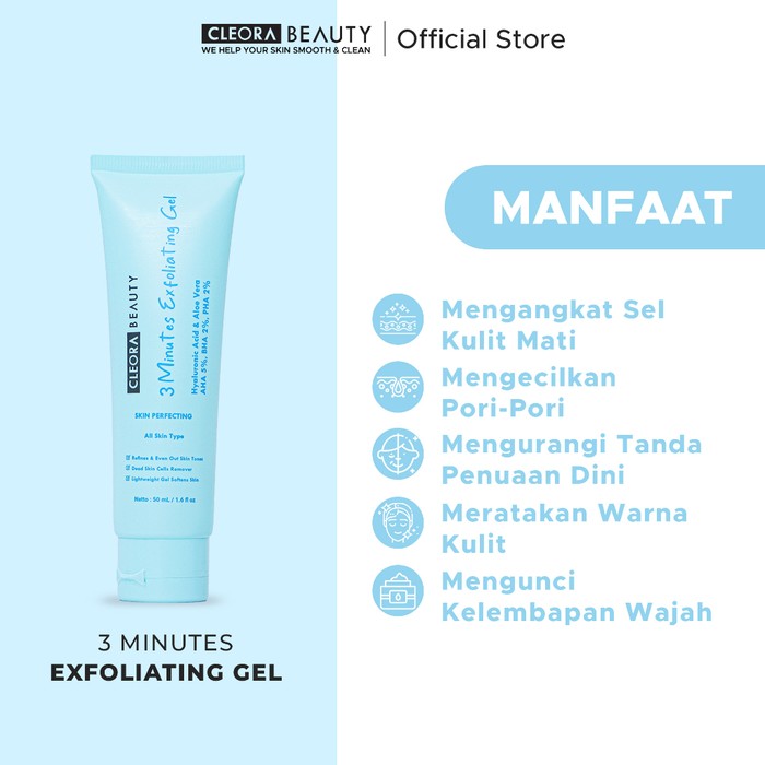 Brand Cleora Beauty Shop mengeluarkan salah satu produk eksfoliasi berbentuk gel, dilengkapi tambahan hyaluronic acid dan aloe vera. Cukup aplikasikan produk Cleora pada kulit wajah dalam keadaan kering. Oleskan secukupnya, diamkan selama 30 detik, kamu bisa mengusapnya dengan gerakan memutar hingga kulit mati terangkat lalu bilas dengan air.