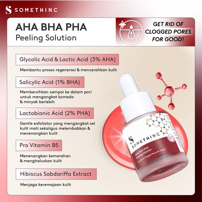 Somethinc AHA BHA PHA Peeling Solution merupakan salah satu produk eksfoliasi berbentuk serum diperkaya sabdariffa extract. Dapat berguna untuk mengangkat sel kulit mati, mengatasi masalah pori-pori tersumbat, komedo, dan menjaga agar kulit wajahmu tetap lembab.