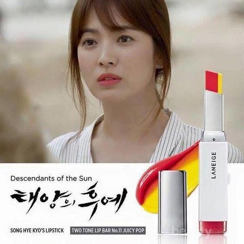 Siapa yang tak kenal dengan artis cantik asal Korea Selatan, Song Hye Kyo. Saat bermain dalam drama hits Descendants of The Sun, lipstick yang diknakannya menuai perhatian dari para penonton. Kesan fresh dan tahan lama membuat Laneige Two Tone Lip Bar menjadi pilihan Song Hye Kyo untuk menyempurnakan penampilannya dalam drama. Pilihan warna lipstick natural yang menjadi trademark sepanjang drama adalah Juicy Pop, perpaduan antara pink dan kuning. Kalau kamu berminat tiru gaya Song Hye Kyo, kamu bisa mendapatkan produk lipstick ini dengan harga sekitar Rp300.000 di online shop kesayangan kamu, dear!