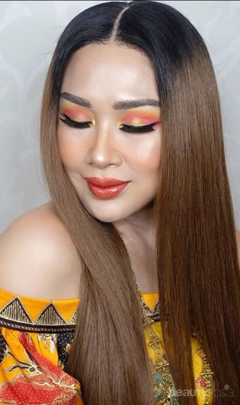 Titi Dj dikenal dengan sebutan Diva ini berani menonjolkan makeup bold dengan warna yang cerah pada bagian mata. Eyeshadow yang diaplikasikan pada mata Titi Dj ini mampu membuat perpaduan warna gradasi yang sempurna sehingga terlihat elegan. Riasan make up Titi Dj ini by Dhirman Putra