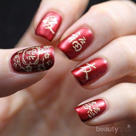 Simbol aksara Chinese dengan makna yang positif juga bisa kamu jadikan motif untuk nail art kamu. Kamu juga bisa memadukan warna merah dengan simbol-simbol berwarna gold agar terlihat spesial.