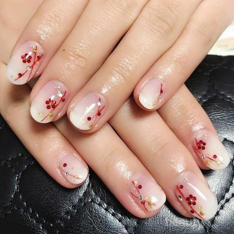 Kamu juga bisa menghias jari-jarimu dengan nail art transparan. Dan mempercantiknya dengan bunga mei hwa berwarna merah atau pink. Sehingga sangat identik dengan Chinese New Year.