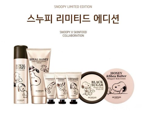 Skinfood tidak mau kalah dalam hal kolaborasi, mereka menggandeng tokoh anjing lucu bernama Snoopy dan teman-temannya untuk dijadikan kemasan yang super cute. Mulai dari cat kuku, stiker kuku, bb cushion, lip oil, dan produk makeup lainnya, Skinfood juga meluncukan koleksi Snoopy untuk skin & body care mereka. Untuk produk skin & body care ada mist, black sugar honey mask, body cream dan hand cream, semuanya diproduksi dalam kemasan Snoopy secara terbatas. Produk andalan mereka adalah black sugar honey mask yang dapat melembabkan kulit tanpa membuat kulit terkelupas dan membuat kulit semakin cerah.