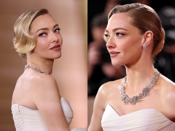 Amanda Seyfried tampil dengan updo yang elegan dan penuh struktur. Ia mengangkat rambutnya ke dalam bentuk retro wave yang halus namun kuat. Tampilan makeup yang digunakan berfokus pada rona peachy lembut di pipi dan bibir yang menyatu harmonis dengan warna kulit bintang The Housemaid ini.