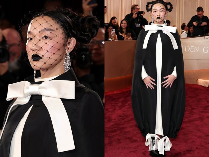 Audrey Nuna menghadirkan statement beauty edgy di Golden Globe 2026 lewat woven braids dan lipstik hitam, tampil berani di tengah dominasi soft glam./Foto: Instagram/audreynuna