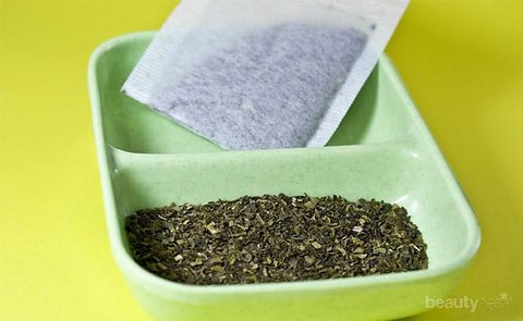 - Siapkan beberapa kantung teh hijau, haluskan dengan cara ditumbuk atau diblender,