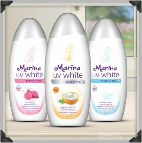 Varian dari hand and body lotion dari Marina juga cukup banyak. Ada Marina UV white yang terdiri dari Bright and Fresh, Hydro Cool, Body Essence, Healthy and Glow, extra spf 15 dan extra spf 30. Selain itu ada Marina Natural yang terdiri dari Rich Moisturizing, Protects and Care, Nourished and Healthy, serta Smooth and Glow. Kemudian varian terakhir adalah Marina Total Care Youthful. Untuk Marina uv white 500ml di Indomaret bisa kamu beli dengan harga Rp18.200 atau Marina Natural 350ml Rp11.900.