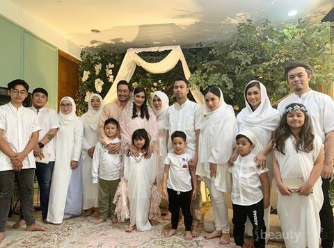 Syahnaz Sadiqah dan suami berpose bersama orang-orang terkasih di acara tasyakuran yang diadakan di rumah sang kakak, Raffi Ahmad.