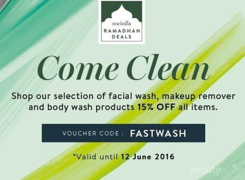 Come Clean Sociolla Ramadhan Deals. Masukkan kode: FASTWASH saat checkout untuk mendapatkan diskon 15% OFF! Promo ini hanya berlaku sampai tanggal 12 Juni 2016.