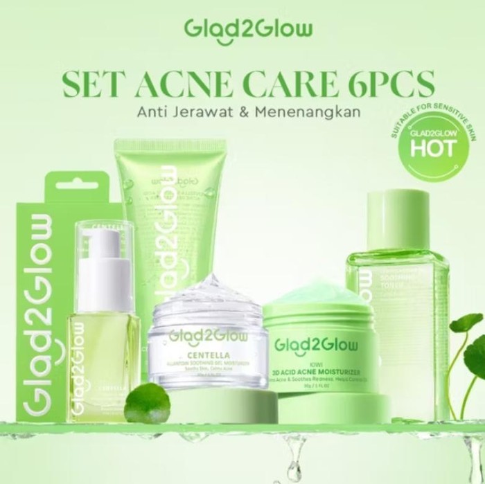 Paket skincare jerawat dari Glad2Glow ini, memiliki kandungan utama berupa Centella asiatica. Terdiri dari pelembab, serum, pembersih wajah, toner dan clay mask. Menariknya, kamu bisa memilih jenis pelembab yang akan digunakan.