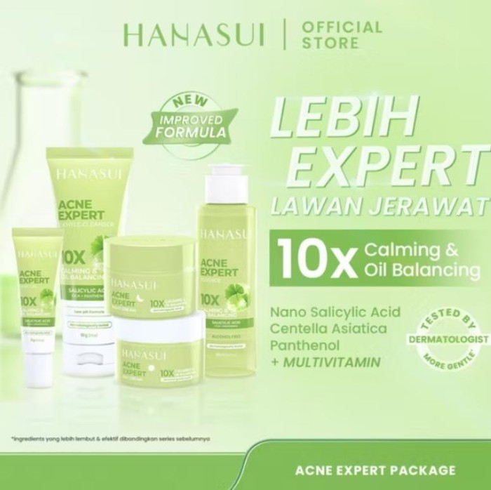 Hanasui punya paket skincare dengan formulasi khusus untuk merawat jerawat, yakni 3 bahan utama berupa nano salicylic acid, Centella asiatica, serta panthenol. Diperkaya pula dengan kandungan multivitamin yang kaya akan antioksidan.