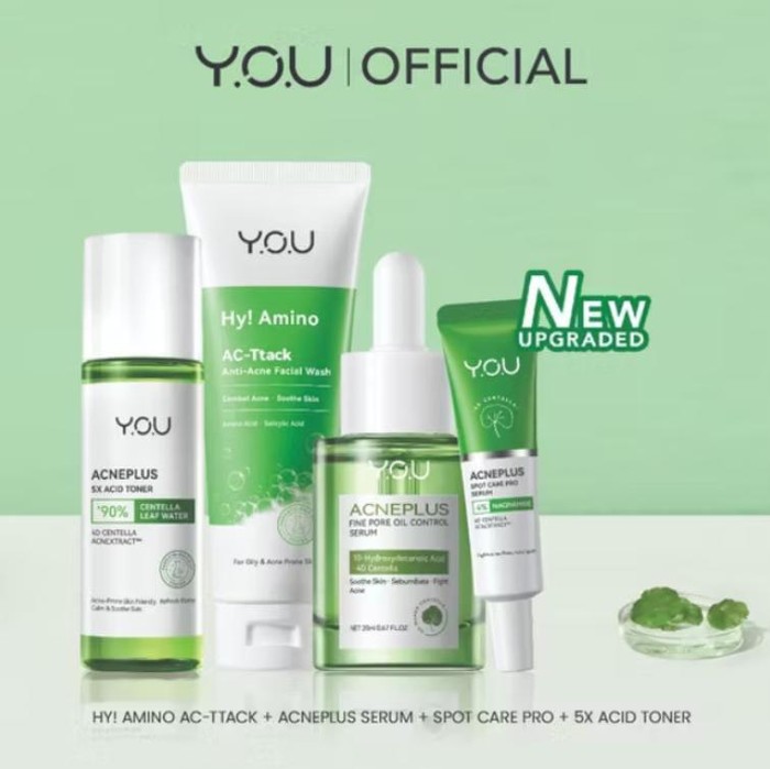 Y.O.U punya paket skincare khusus jerawat, yang diperkaya dengan kandungan Centella asiatica, herbal fusion actives, serta pH Balanced Formula. Kerjasama formulasinya mampu menenangkan kulit berjerawat, menjaga kekuatan skin barrier, sekaligus mencegah tumbuhnya jerawat baru.