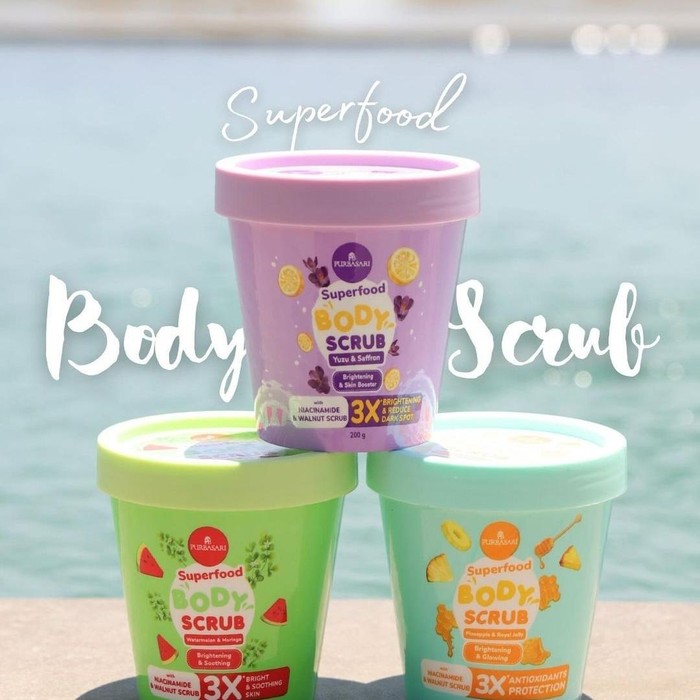 Purbasari Superfood Body Scrub dapat mengatasi kulit kusam dan debu dengan aroma buah yang menyegarkan. Produk ini terdapat tiga varian menarik yaitu Yuzu & Saffron, Watermelon & Moringa, dan Pineapple & Royal Jelly.