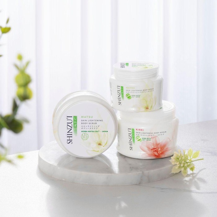Shinzu'i Skin Lightening Body Scrub merupakan produk dengan bahan utama Herba Matsu Oil Jepang dan minyak esensial dari jamur Matsutake, body scrub ini tidak hanya berfungsi sebagai eksfoliator, tetapi juga dapat memudarkan pigmentasi dan melembabkan kulit. Setelah digunakan, kulit terasa lebih bersih, kenyal, dan bercahaya.