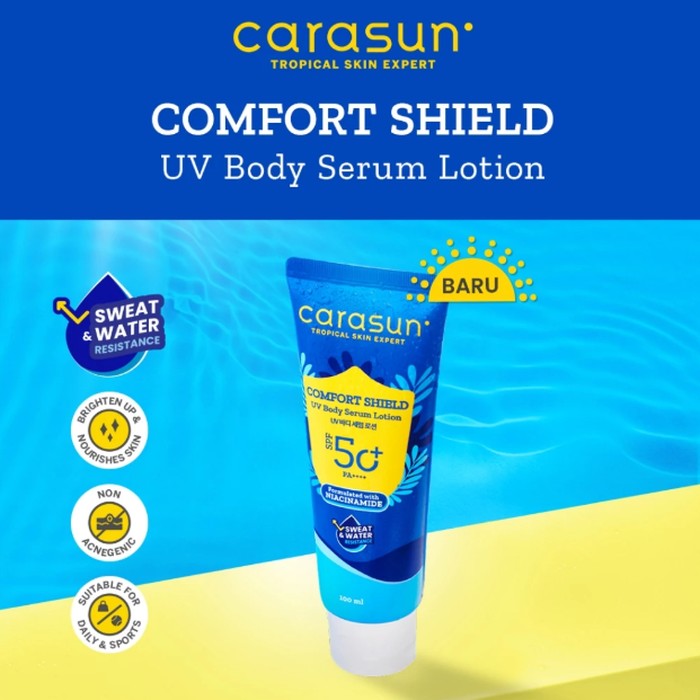 Jika Beauties cari body sunscreen yang sweat and water resistance, maka Beauties bisa mencoba Comfort Shield UV Body Serum Lotion oleh brand Carasun. Sunscreen ini punya SPF 50 PA+++ yang ringan, cepat meresap, dan tidak lengket di kulit.