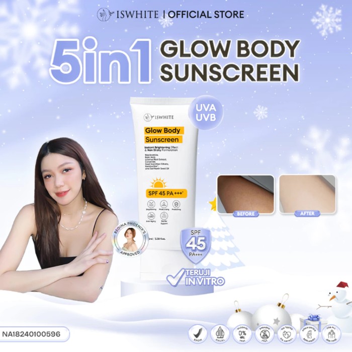 Setelah viral dengan produk Body Mask-nya, Iswhite juga merilis Glow Body Sunscreen SPF 45 PA+++. Selain melindungi kulit dari paparan sinar matahari, produk ini juga membantu merawat dan mencerahkan kulit tubuh.