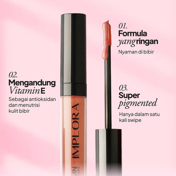 Implora Urban Lip Cream Matte memiliki formula yang lembut dan vitamin E yang mengandung antioksidan yang membantu melembapkan bibir. Produk ini memiliki tekstur yang creamy, full coverage, dan non cracking.