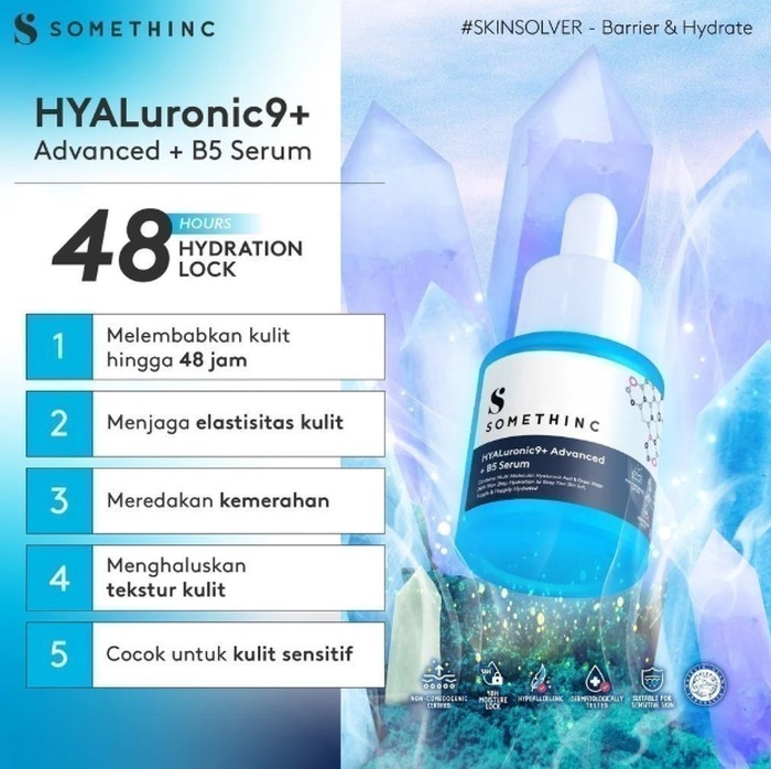 Sebagai brand yang dianggap tidak pernah tidur, Somethinc juga merilis serum hydrating sebagai salah satu produk unggulannya. Serum Somethinc diperkaya dengan 9 jenis hyaluronic acid, yang mampu memberikan kelembapan kulit selama 48 jam.