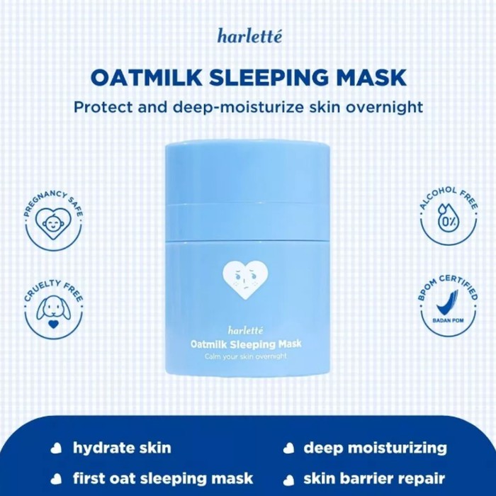 Brand lokal, Harlette dikenal dengan produk-produknya yang berbahan dasar oatmilk, tak terkecuali Oatmilk Sleeping Mask. Produk ini diperkaya dengan oat dan sodium lactate (Dari susu) yang dapat membantu meredakan kulit bermasalah dan menenangkan kulit dari kemerahan.