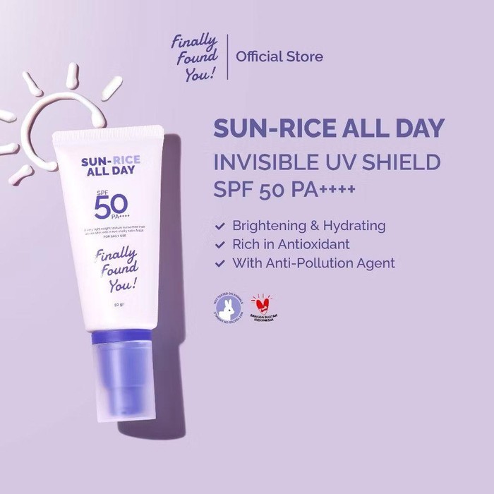 Nama brand Finally Found You sedang naik belakangan ini karena produk-produk skincare yang banyak dicari oleh para beauty enthusiast. Salah satu produk andalannya adalah Sun-Rice All Day Invisible UV Shield SPF 50 PA++++ yang memiliki kandungan 2% niacinamide, 1% panthenol, 8x hyaluronic acid, 6x ceramide, ectoin, dan rice brand water yang berfungsi mencerahkan dan melembapkan kulit.