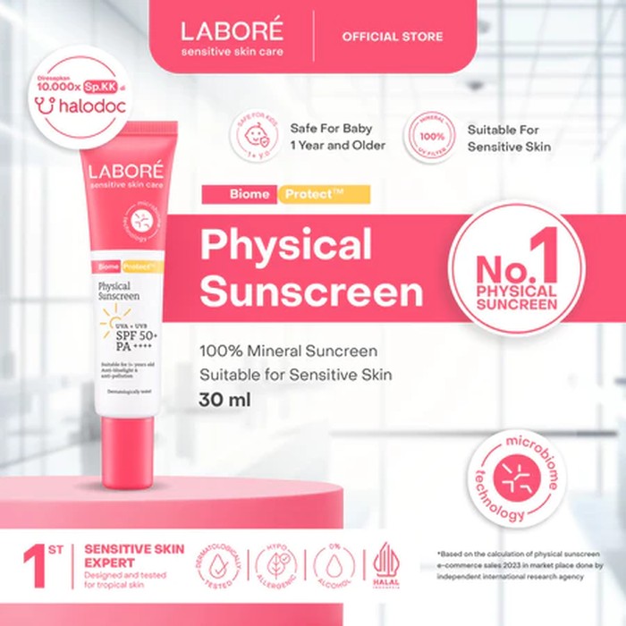 Labore memiliki produk sunscreen andalan dengan kandungan 100% mineral dan Broad Spectrum Protection. Mampu melindungi kulit dari sinar UVA dan UV, sekaligus polusi dan blue light.