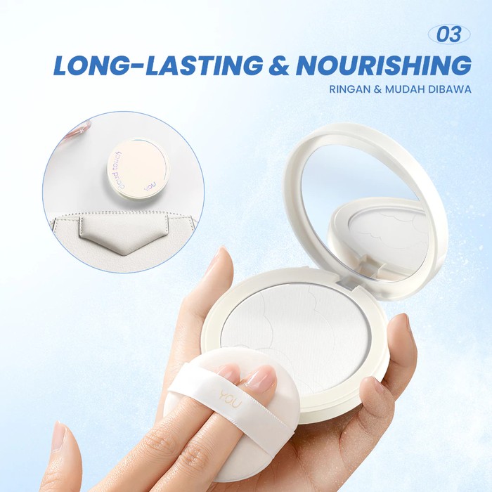 YOU memiliki formulasi khusus dengan kandungan skincare untuk setting powdernya satu ini. Diperkaya dengan Ceramide yang membantu menjaga kelembaban, sekaligus pertahanan skin barrier. Kandungan Soybean ferment extract menjadi sumber antioksidan, serta formulasi Natural mica bantu menyerap minyak berlebih.
