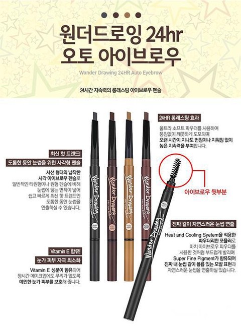Holika Holika Wonder Drawing 24HR Auto Eyebrow Pencil juga memiliki pensil dengan ujung segitiga untuk memudahkan penggunanya. Yang menjadi kelebihan adalah staying power dan formulanya yang smudge-proof. Tentunya, para pecinta pensil alis harus sekali memiliki produk anti luntur ini, bukan? Selain itu, pensil ini dapat mengisi hanya beberapa bagian yang kosong tanpa harus menggambar semua alis. Keuntungan ini akan membuat alis kita tetap natural.