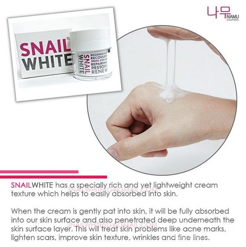 Snail White Cream adalah salah satu skincare Thailand terbaik berupa cream wajah dengan kandungan utama berupa ekstrak lendir siput yang akan membentuk sel-sel kulit baru sehingga kulit wajah kamu tampak lebih cerah sekaligus berfungsi sebagai antiaging. Kandungan lengkapnya antara lain:
