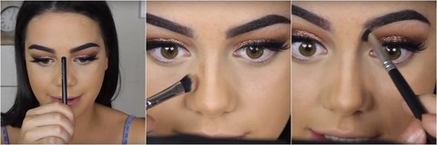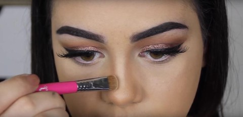 Kedua: Gunakan produk dengan warna yang lebih terang di tengah garis yang sudah kamu buat pada langkah pertama (bagian ujung hidung) dan di bagian samping garis (bagian luar hidung). Warna yang lebih terang ini nantinya akan bisa mempertegas warna gelap dan menciptakan efek bayangan di hidung.