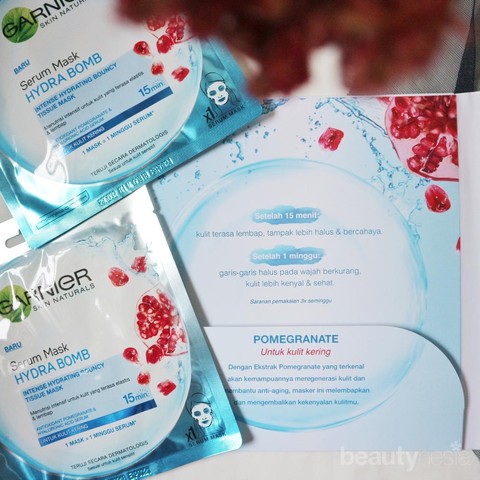 Masker Garnier HydraBomb punya dua varian yaitu pomegranate (kemasan warna biru) dan green tea (kemasan warna hijau). Sama seperti Sakura White, masker ini berjenis masker tissue. Masker extra tipis ini didesain khusus untuk bentuk wajah orang Asia sehingga saat memakainya terasa pas di wajah.