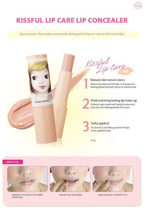 Buat kalian yang pengen banget bikin ombre lips secara sempurna, Kissfull Lip Care Lip Concealer dari Etude House adalah barang yang wajib kamu miliki. Dengan ini kamu juga bisa menutupi bagian hitam pada bibir kamu agar lipstick yang kamu gunakan warnanya sesuai ekspetasi. Fungsi utamanya selain mengcover warna dasar bibir,concealer ini juga melembutkan , jadi ketika menggunakan lipstick matte sekalipun hasilnya akan sangat bagus dan bikin lipstick kamu lebih tahan lama. Cara Pakai nya mudah kok, cukup apply dibagian luargaris bibir dan ratakan dengan menepuk nepuk ringan menggunakan jari. Lalu pake lipstick, lipmatte atau liptint kesukaan kamu deh