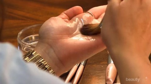 Jika dirasa brush sudah cukup bersih dan sisa-sisa makeup yang menempel sudah luntur, celupkan ujung brush pada semangkuk air hangat. Sisa-sisa oil cleanser yang menempel pada brush akan larut menjadi busa.