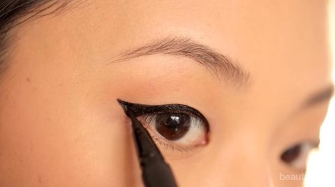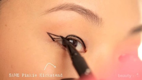 Buatlah garis dari sudut mata bagian dalam hingga ke sudut mata bagian luar, buatlah garis semakin meninggi ke arah luar. Sedikit tips dari Jen Chae, kamu bisa meletakkan jari kelingkingmu di atas pipi agar posisi tangan lebih stabil saat membuat garis.