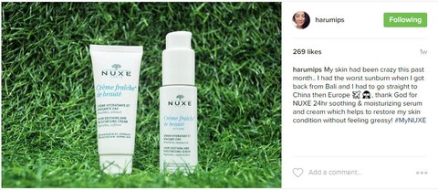 "My skin had been crazy this past month. I had the worst sunburn when I got back from Bali and I had to go straight to China then Europe ✈️🙈, thank God for NUXE 24hr soothing & moisturizing serum and cream which helps to restore my skin condition without feeling greasy! #MyNUXE"https://www.instagram.com/p/BKFnrrUAqxD/