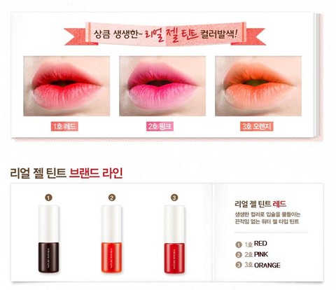 Nature Republic Real Gel Tint adalah lip tint Korea bertekstur gel yang terasa ringan di bibir, seperti mengoleskan air. Mengandung ekstrak buah-buahan Raspberry, Sweet Cherry dan Orange untuk menjaga kelembaban bibir. Untuk ukuran lip tint Korea, warnanya cukup tahan lama. Keterbatasan Nature Republic Real Gel Tint ada pada pilihan warna, karena hanya tersedia tiga varian. Ada warna merah, pink, dan oranye.