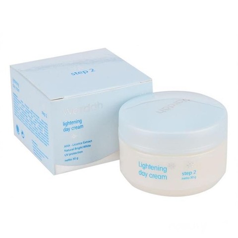 Setelah menggunakan produk-produk di atas, kamu bisa melanjutkan perawatan dengan Wardah Lightening Day Cream. Produk yang satu ini memiliki kandungan ekstrak rumput laut dan allontoin yang dapat menghambat pigmentasi kulit dan meremajakan kulitmu. Gunakan day cream ini setiap pagi sebelum beraktivitas dengan mengoleskannya pada wajah dan leher. Kamu cukup mengaplikasikannya cream ini secara tipis saja, yang penting kamu mengoleskannya secara merata. Day cream ini juga terbagi atas dua produk, step 1 dan step 2.