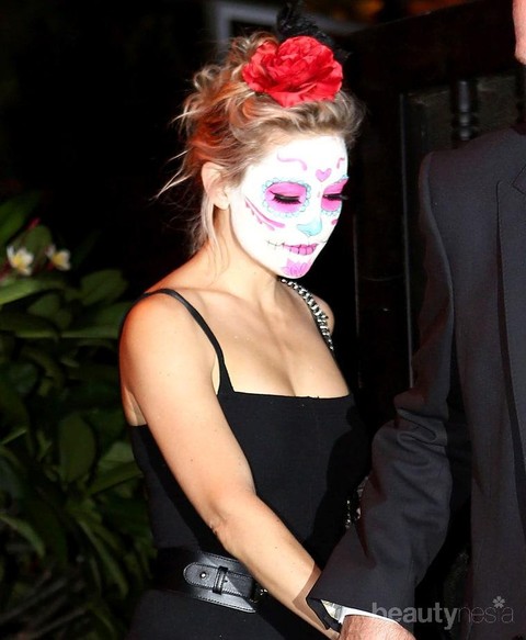 Kate memilih tampil unik dengan make up sugar skull. Make up yang digunakan menyerupai tengkorak ini dihiasi dengan warna-warna manis dan hiasan hati dan pita-pita lucu. Jadi, untuk kamu yang takut kaget melihat wajah sendiri, lebih baik kamu memilih riasan seperti ini.