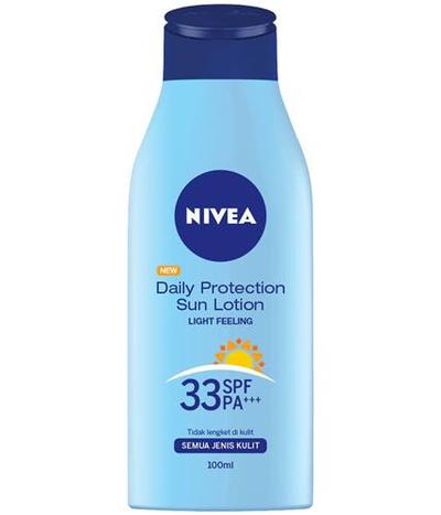 Untuk aktivitas sehari-hari ladies bisa menggunakan Nivea Daily Protection Sun Lotion SPF 33P 100 ml. Produk ini mengandung Vitamin C dan antioksidan yang berfungsi untuk melawan radikal bebas yang disebabkan oleh polusi dan sinar matahari langsung. Pada musim kemarau tidak usah khawatir kulit kering karena sunblock ini juga memiliki kandungan Hydra ID yang membantu melembabkan kulit. Dengan pemakaian teratur, memberikan perlindungan secara optimal dari efek negatif sinar matahari sekaligus melembabkan kulit lebih dari 24 jam.