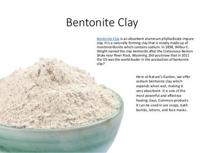 Tanah liat bentonit adalah jenis tanah liat yang memiliki sifat alami menyembuhkan dan detoksifikasi. Jenis tanah liat ini diekstrak dari abu vulkanik gunung berapi. Komponen dari tanah liat bentonit terdiri dari: zat besi, kalium, silika, natrium, dan kalsium, yang kesemuanya adalah jenis mineral yang bermanfaat dalam perawatan kulit sehat.