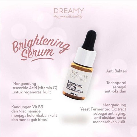 Foto: https://www.instagram.com/dreamy.nikitawillyTahap penggunaan serum ialah tahap yang tak boleh kamu lupakan jika ingin mendapatkan hasil maksimal. Serum kaya akan bahan aktif yang bermanfaat bagi kulit. Brightening serum dari Dreamy by Nikita Willy ini sendiri bermanfaat untuk mencerahkan dan meratakan warna kulit, mengecilkan tampilan pori, membantu menghilangkan tanda penuaan seperti kerut-kerut di wajah.
