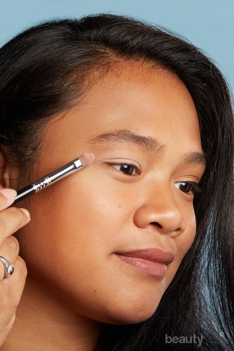 Pertama ambil kuas mata yang tebal dan rata dan rata, gunakan warna matte beige bernama Solid Gold dan gosokkan di kelopak mata dengan lembut. Tepuk-tepuk kuas hingga warna menyatu dikulit. Lapisan ini merupakan dasar yang membuat lipatan dan bayangan tutup sehingga terlihat lebih cerah.