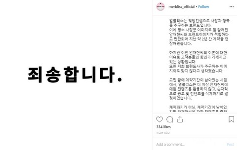 Soompi, Pihak MERBLISS mengatakan, “Kami tidak dapat menyembunyikan rasa kaget kami atas perceraian Ahn Jae Hyun yang jadi kontroversi dan permasalahan yang di ungkap di media sosial. Atas masalah ini, kami dengan tulus meminta maaf kepada para konsumen yang sudah percaya dan membeli produk kami,”