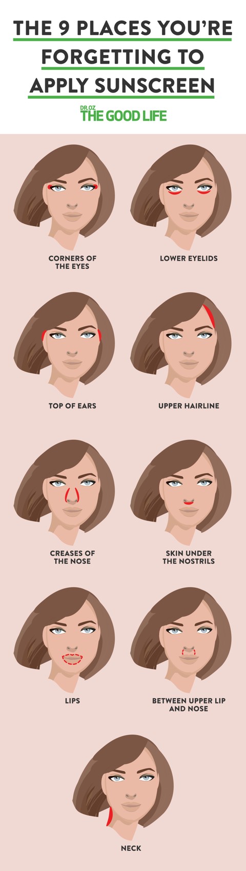 Dilansir dari laman website Dr Oz The Good Life, seorang pakar dermatologis asal Amerika Serikat. Alicia Barba memiliki salah satu teori: orang cenderung mengabaikan 9 daerah berikut saat mengaplikasi kan suncreen pada wajah mereka yakni pada sudut mata, bawah kelopak mata, bagian atas telinga, bibir, area cupid bow, garis rambut, cuping hidung, kulit di bagian bawah hidung dan leher.